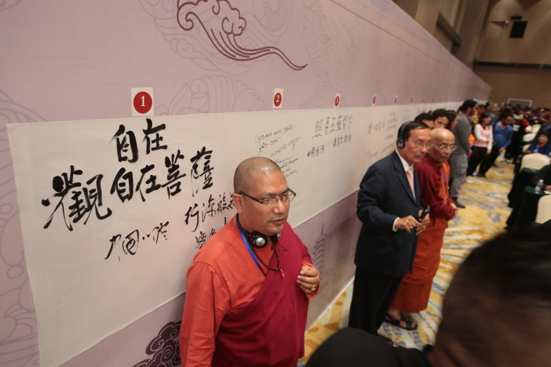 开幕式举行了“一带一路”沿线国家代表书写《心经》仪式,来自30个国家的学者、高僧、大使馆参赞、留学生代表共同用本国语言书写了《心经》。并从多个角度加以研讨,从这篇古代先哲引导人们追求至善至美至真的经文中感悟不朽的精神境界,意义十分重大。